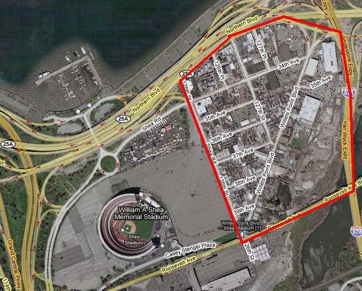 Anyone that has been to Shea should already have an idea of the 70-acre Iron Triangle, but the photo above gives an idea of how large it is (click photo for full size). Redevelopment of the Iron Triangle will only help a possible SSS to be built in the area. Currently, most of the Iron Triangle does not have a sewer system, streetlights, or paved streets. The Iron Triangle is also full of auto shops that have not been maintained and some have been illegally built. Redevelopment will allocate city money for construction projects, make the area more attractive to private investments, and improve infrastructure. I am against the use of eminent domain in the majority of cases, but the Iron Triangle's case is an exception. No homeowners will be displaced and the benefits far outweigh the harm.